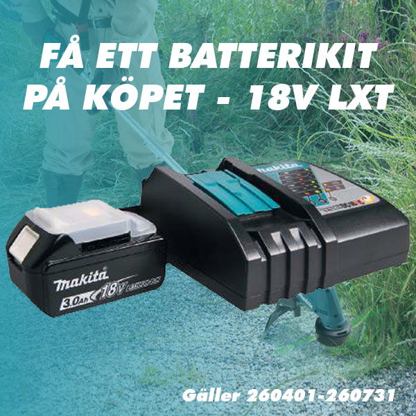 Gäller vid köp av kampanjmodeller under perioden 1 april till 31 July 2026. Få ett 3,0 Ah batteripack samt laddare på köpet hemskickat direkt från Makita Sverige. Registrering sker på www.makita.se.