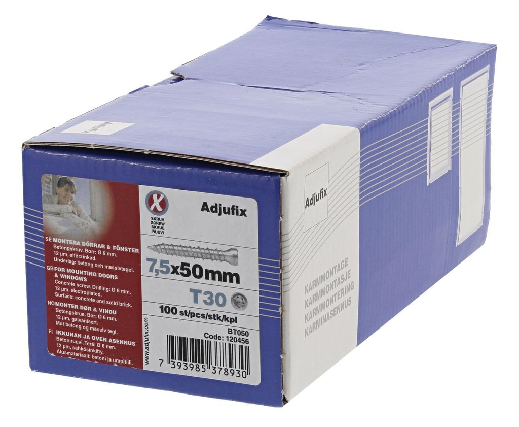 Adjufix Betongskruv är speciellt utformad för installation i betong och massiv tegel. Skruven mäter 7,5x50mm, har en skruvskalle för torx 30 bits och kommer i paket om 100. Med sitt specialdesignade huvud och high-low gänga säkerställer de optimal hållkraft och minskad risk för överskruvning.