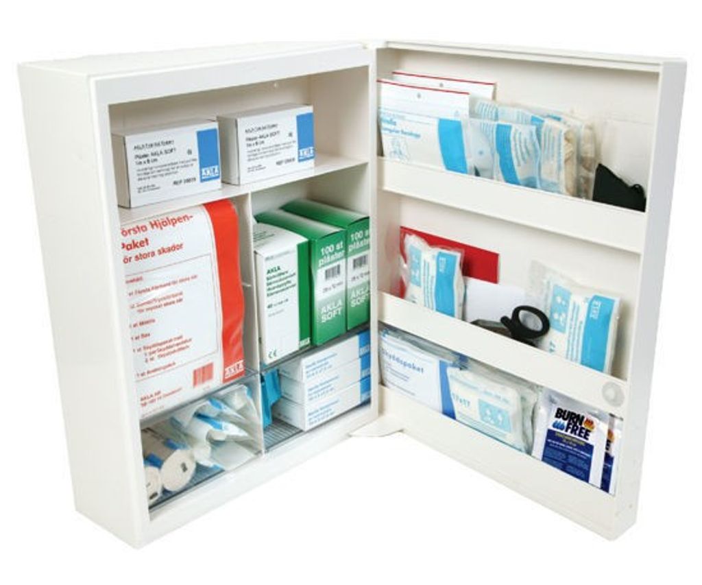 Tillverkade av 3 mm slagfast plast. Skåpet används som central Första Hjälpen-plats samt påfyllningsdepå för övriga Första Hjälpen-utrustningar.