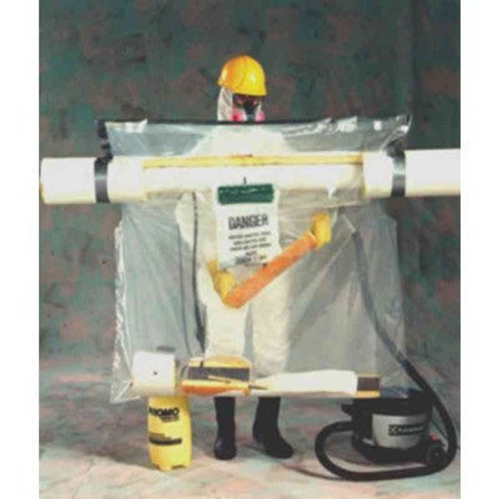 Glove bags för säker sanering av asbest. Försedda med insvetsade handskar och dubbelhäftande upphängningstejp.