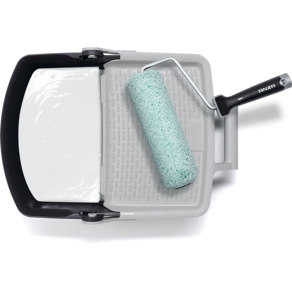 Glöm spill, kladd och för lite färg i rollern. Nya färgtråget från Anza är som en hybrid mellan tråg och hink. Det tar rejält med färg, har lång avrullningsyta, står stabilt på underlaget – och när du ska vidare är det bara att greppa tag i handtaget.