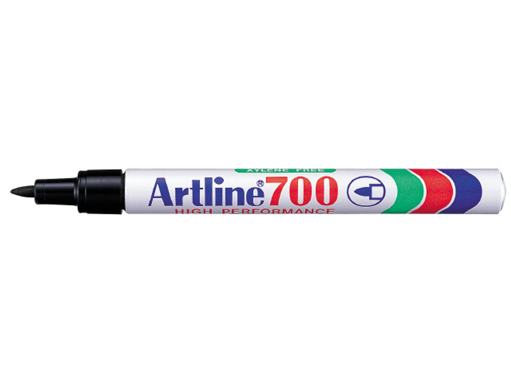 Artline 700 är en robust märkpenna med aluminiumhylsa och permanent vattenfast färg. Den torkar mycket snabbt, bleks inte och fäster på svårmärkta material som metall, plast, glas, papper, kartong och textil. Rund akrylspets 0,7 mm ger jämna linjer och exakt märkning. Fri från xylene för lägre lukt och bättre arbetsmiljö.