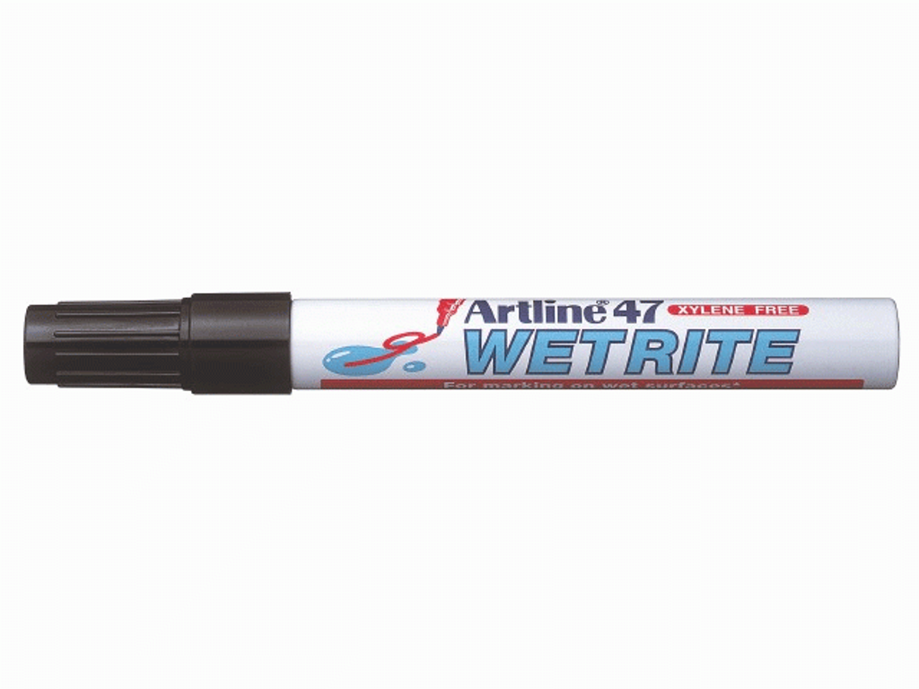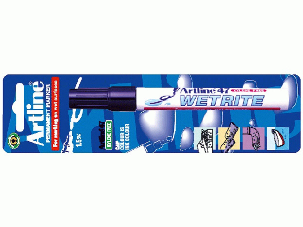 Artline Märkpenna för att skriva och märka på våta underlag, även under vatten. Idealisk för märkning på våta icke porösa ytor som metall, plast, gummi, plåt, sträckfilm och frigolit m.m. Pennan kan inte användas på vått glas eller vått kakel. Pennhylsa av slagtålig aluminium. Nästan luktfri. 1.5 mm rund akrylspets. Fri från xylene.