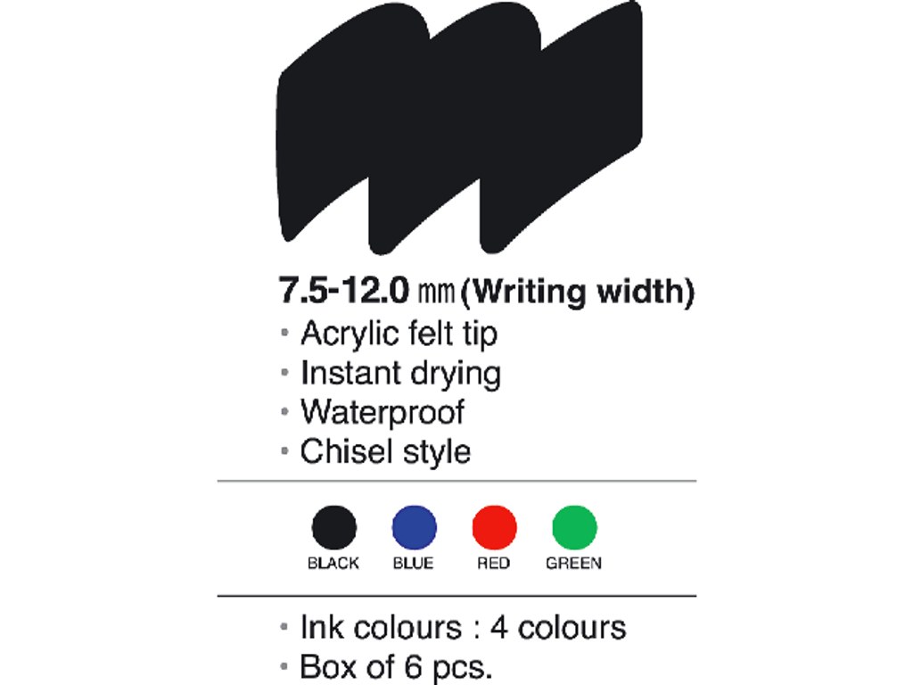 Artline Filtspetspenna för märkning och textning på de flesta material. Pennkropp av aluminium. Vattenfast, snabbtorkande. Påfyllningsbar. Med rektangulär spets, 12×7.5 mm snedskuren filtspets. Fri från xylene.