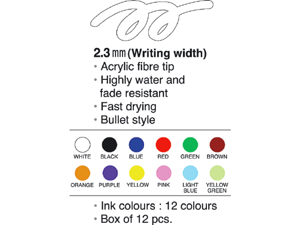 Artline För märkning och textning med krav på hållbarhet och utomhusbruk. Lämplig på svårmärkta material som metall, plast, glas, gummi, etc. Extra färgtäckningsförmåga. Snabbtorkande. Rund spets, diam. 2 mm. Fri från xylen.