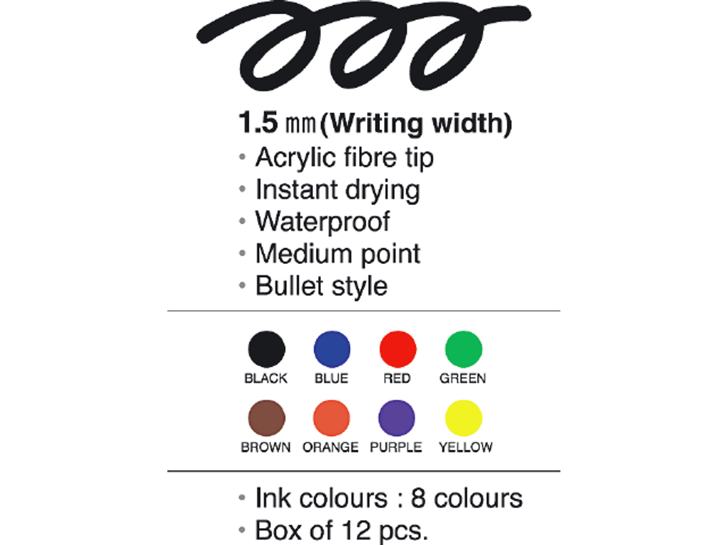 Den runda fina spetsen 1,5 mm ger jämn och kontrollerad linjebredd som gör textning och märkning enkla och precisa. Skriv på papper, kartong, glas och porslin med samma goda fäste, perfekt för allt från etiketter och pärmryggar till burkar och verktyg. Svart färg ger maximal kontrast och bra läsbarhet på ljusa underlag.