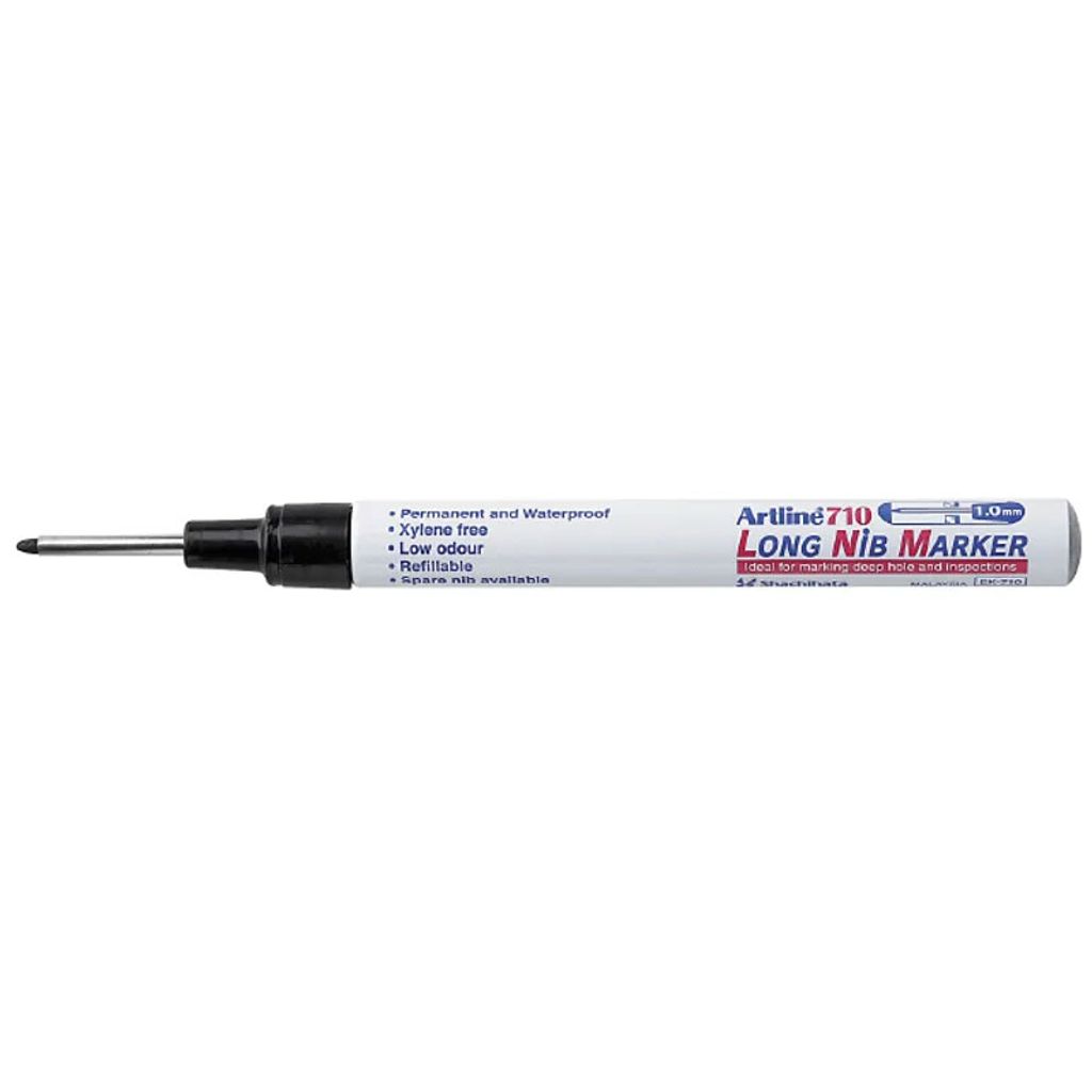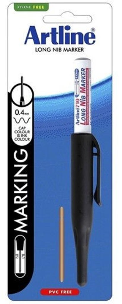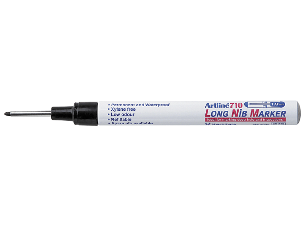 Artline 710 Long Nib Marker har ett 30 mm långt metallrör med en 2.8 mm rund fiberspets. Ytterligare 10 mm infästning av metallspetsen, gör det möjligt att märka i svårtillgängliga hål upp till 40 mm.