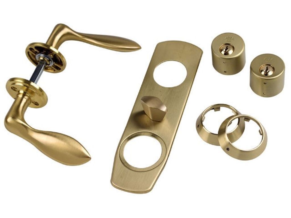 Förpackningen innehåller: Vredskylt 4356, Handtag 1956 (B1-sats) eller 1918 (B2-sats), Cylinder 1212 med 5 st nycklar kopieringsskyddade, Cylinderbehör 3212, samt tillbehörspåse med 1 styck förlängningsdel samt skruv. Behörssats i rostfritt med trycke 8665 (B3-sats).
