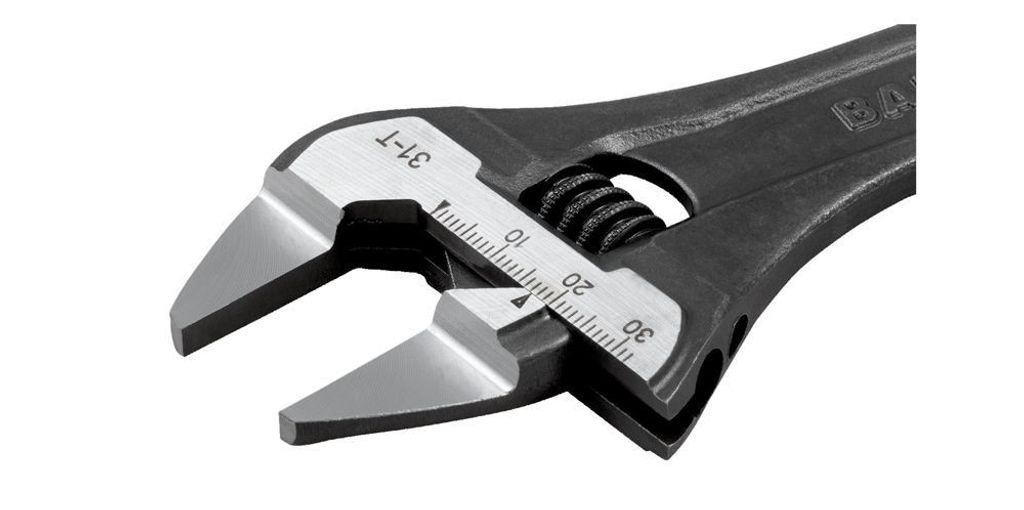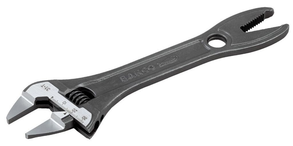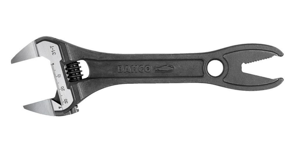 Bahco 31-T är en skiftnyckel med hajkäft med extra tunna käftar och skaftände med rörgrepp och en svartoxiderad yta.