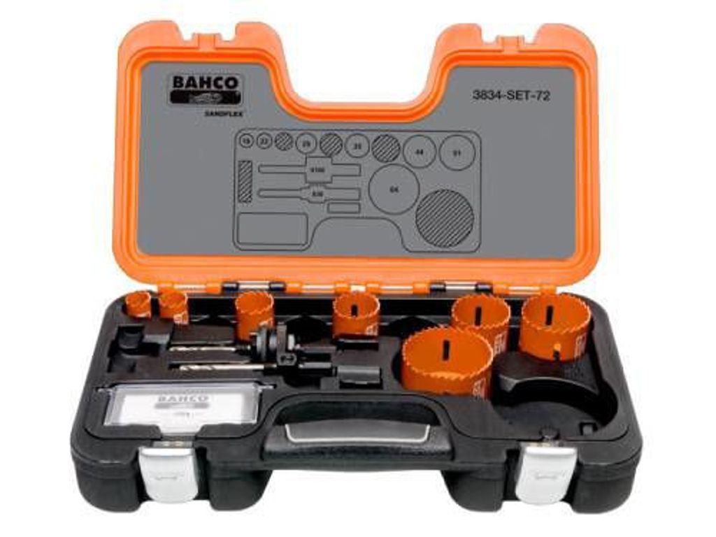 Bahco 3834-SET-72 Sandflex bimetallhålsågssatser med populära storlekar för verkstadsindustrin, vatten- och sanitetsinstallationer samt elinstallationer.