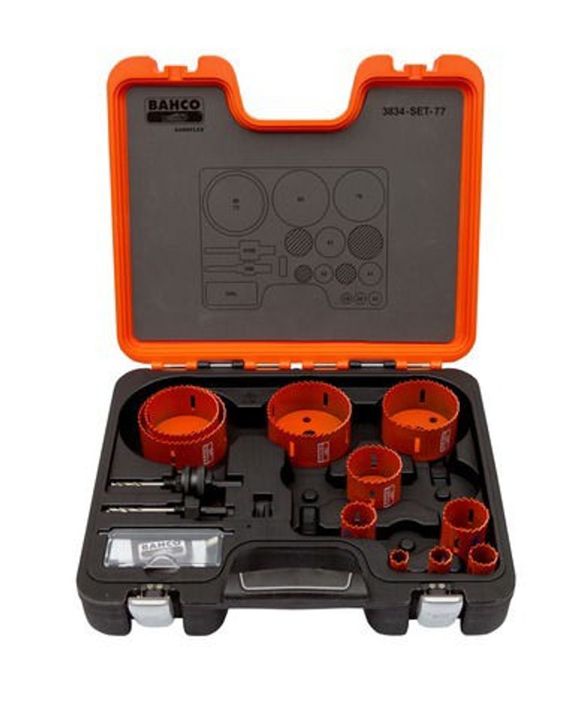 Bahco 3834-SET-77 Sandflex bimetallhålsågssatser med populära storlekar för verkstadsindustrin, vatten- och sanitetsinstallationer samt elinstallationer.