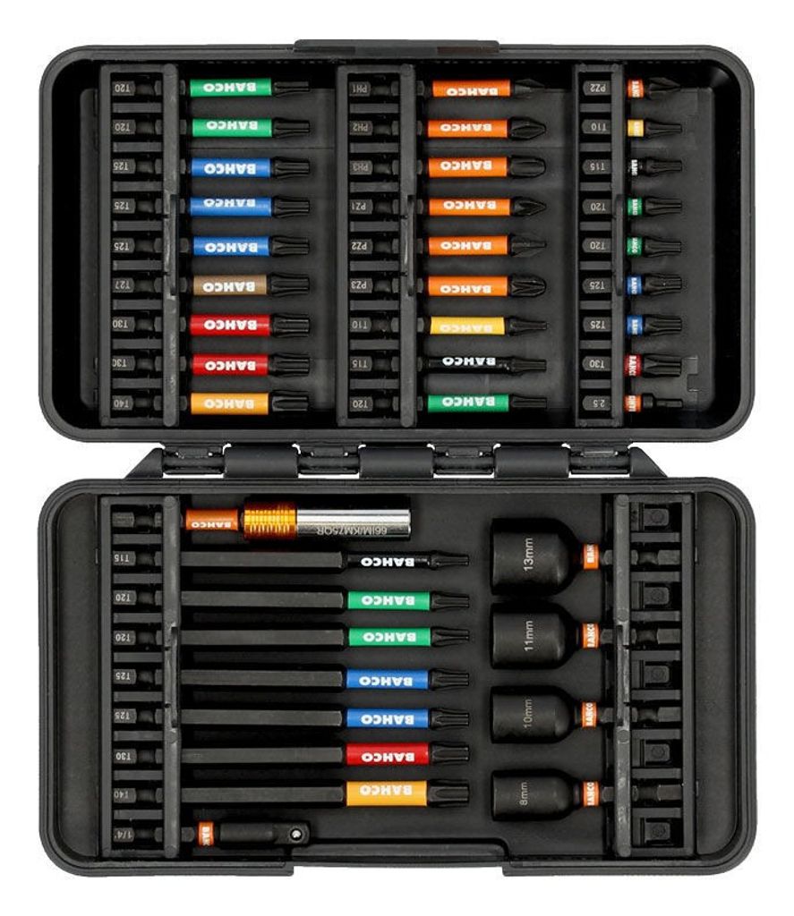 Bahco 66IM/40C-1 är en 40-delars krafttorsionsbitsats för Phillips-, Pozidriv-, Torx®- och sexkantskruv. Satsen innehåller kraftbits, en tunn magnetisk bitshållare med snabbfäste, magnetiska krafttorsionsbits och en krafttorsionshylsadapter. Bitsen har färgmärkning för enkel identifiering och är designade för att tåla högt vridmoment och långvarig användning.