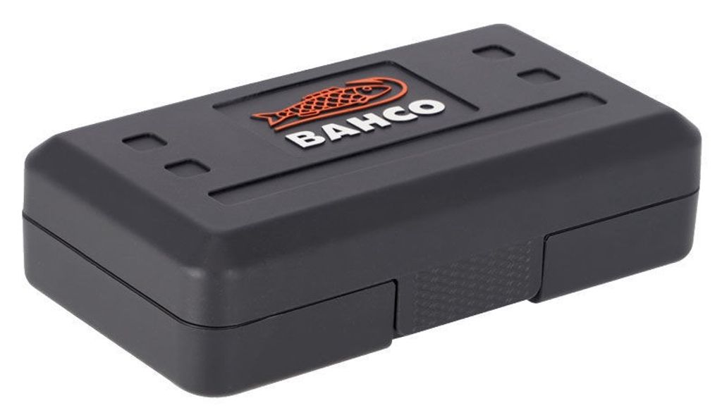 Den magnetiska bitshållaren har en längd på 75 mm och är utrustad med ett snabbfäste och låsningssystem som säkerställer att bitsen hålls på plats under användning. Den tåliga glasfiberförstärkta plastlådan skyddar bitsen och har en patenterad 180º låsfunktion som håller lådan i öppet läge utan att locket kan stängas om fingrarna. Locket kan enkelt tas loss och sättas tillbaka för flexibel förvaring i verktygslådor eller verktygssatser.