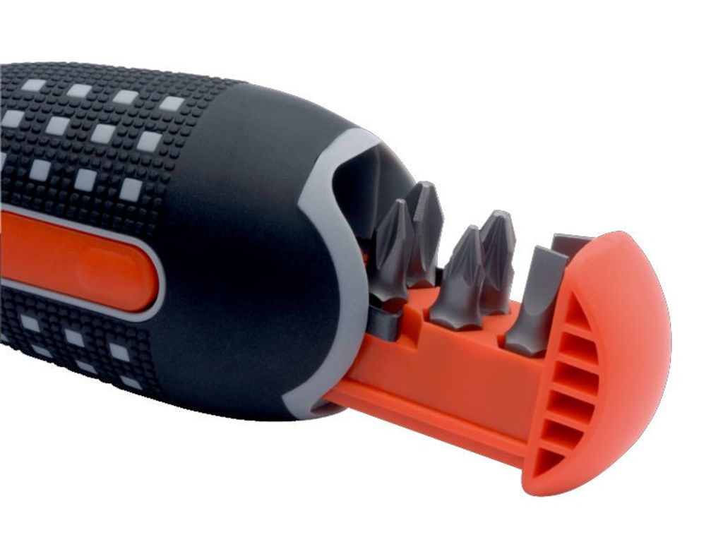 I änden av skaftet finns det en praktisk behållare med en öppningsknapp. Denna behållare innehåller sex olika bits, inklusive PH 1, PH 2, PZ 1, PZ 2, och spår 4,5 mm och 5,5 mm.