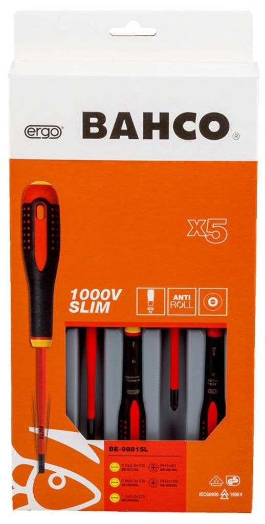 Bahco BE-9881SL är en högkvalitativ skruvmejselsats med 5 isolerade skruvmejslar, utvecklade för arbete under spänning upp till 1000 V. Satsen innehåller både spår- och Phillips-mejslar, tillverkade med extra smala klingor för bättre åtkomlighet. Skruvmejslarna har ergonomiska ERGO™-handtag som ger maximal komfort och kraftöverföring. De svartoxiderade spetsarna ger hög precision, medan handtagen är färgmärkta för enkel identifiering. Godkända enligt IEC 60900 och testade med 10 000 V i vattenbad. Levereras i en praktisk pappkartong.