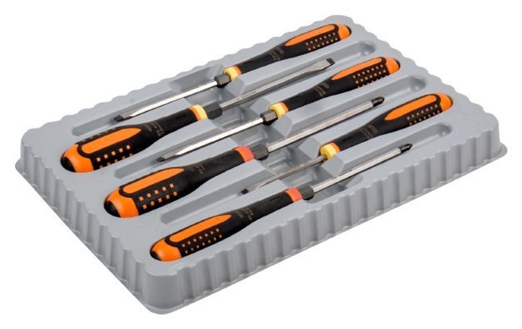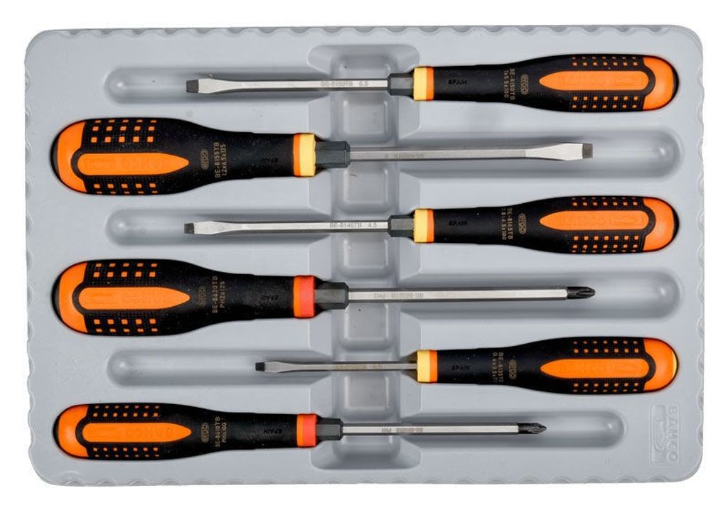 Bahco BE-9881TB är en 6-delars skruvmejselsats bestående av PH & spårskruvmejslar med genomgående klinga.