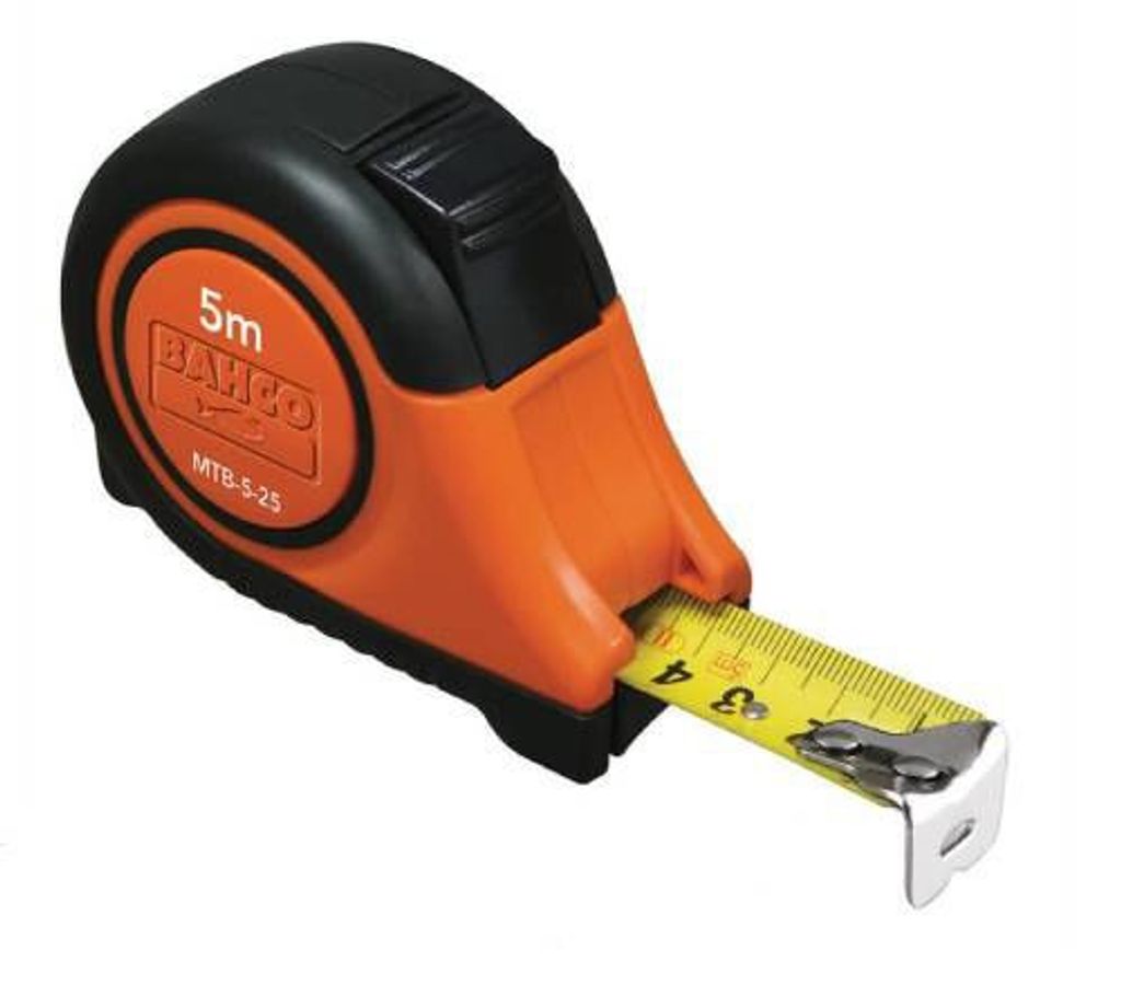 Bahco MTB-5-25-M är ett professionellt måttband med magnetisk ändhake, 5 meter långt och med dubbelsidig mm-skala. Utrustat med automatisk låsning, bältesklämma och slitstarkt nylonöverdrag för pålitlig och exakt mätning i krävande miljöer.