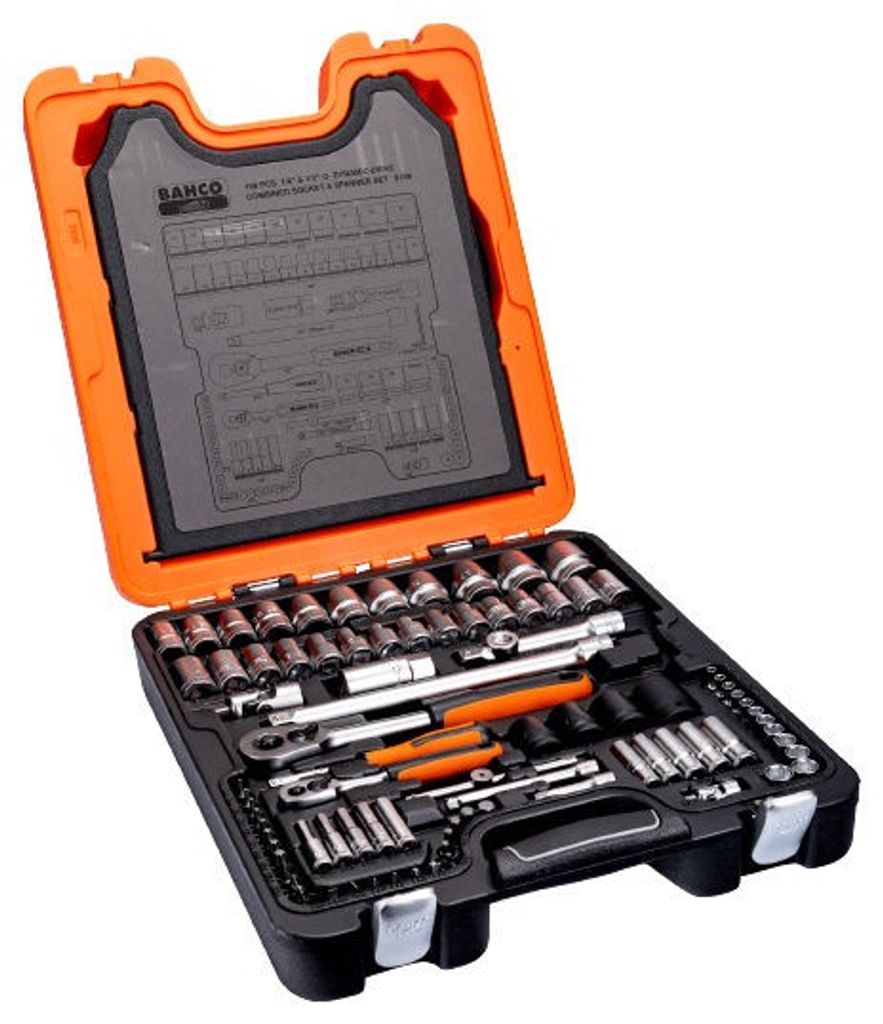 Bahco S108 är en omfattande 1/4" och 1/2" hylsnyckelsats, inklusive sexkantshylsor, Torx®-hylsor, bitshylsor, förlängare, T-stångshandtag, universalknutar, spärrhandtag, ledhylsnycklar, U-ringnycklar och mer. Tillverkad av högkvalitativ stållegering med matt yta, uppfyller den standarderna ISO 1174 och DIN 3120. Levereras i en HDPE-plastväska.