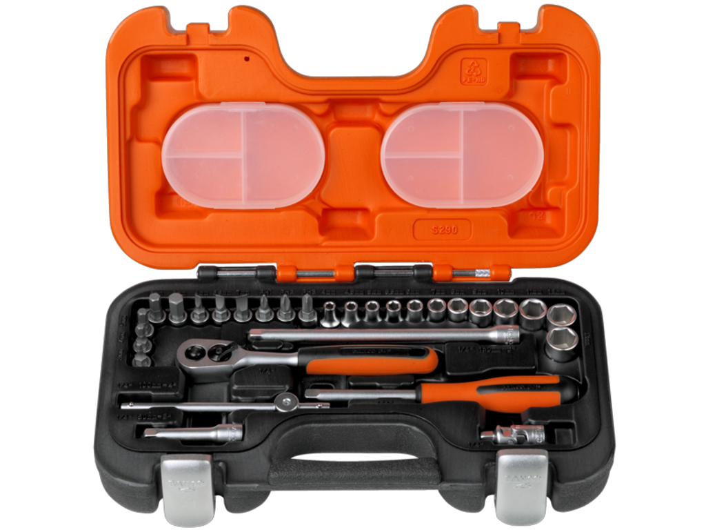 Bahco S290 är en komplett hylsnyckelsats med 1/4" hylsor i alla dess slag komplett förpackat i en smidig förvaringsväska i plast.