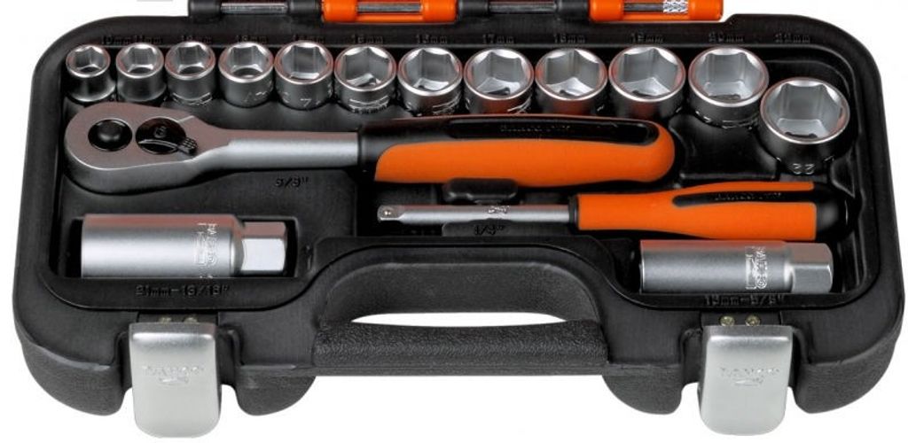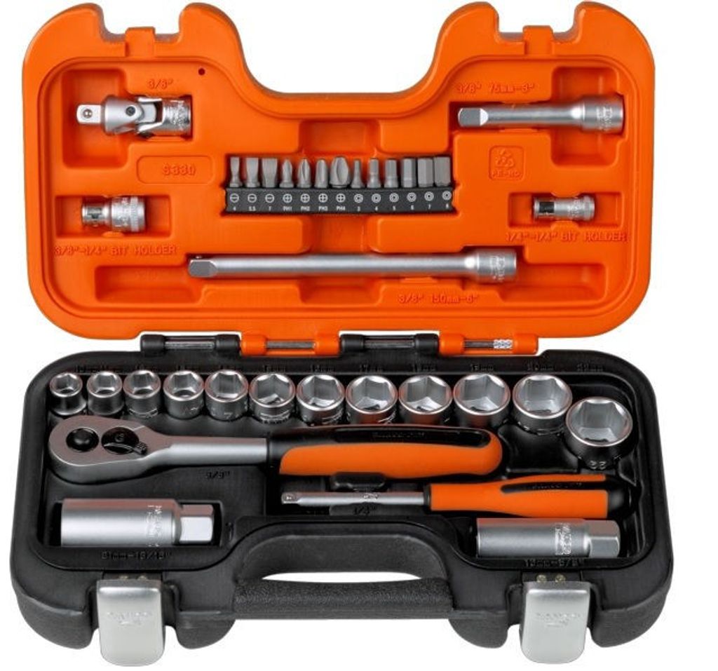 Bahco 33-delars Hylsnyckelsats innehåller både verktyg för 1/4" och 3/8". Komplett sats med hylsor och tillbehör som är smidigt förpackade i en förvaringsväska av plast.