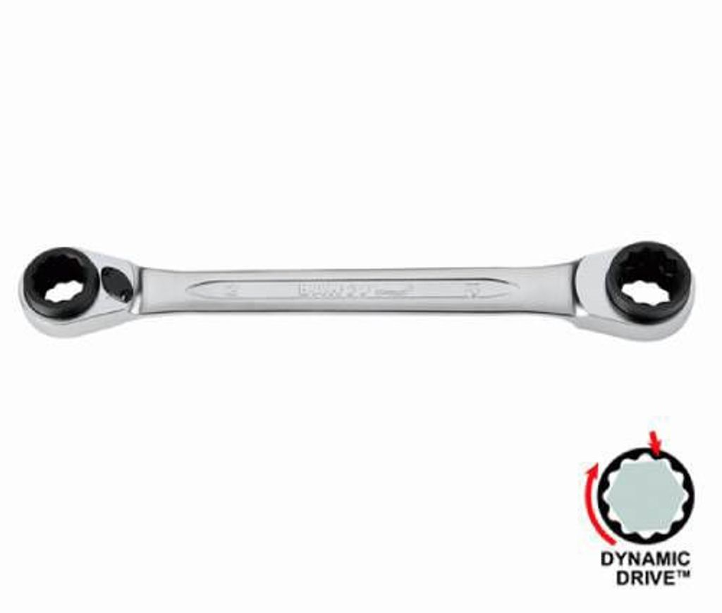 Bahco Spärringnyckel med metriska dimensioner. Spärringnyckeln har 4 storlekar i ett. Bahco S4RM är av smitt, förnicklat och mattförkromat högkvalitativt stål.