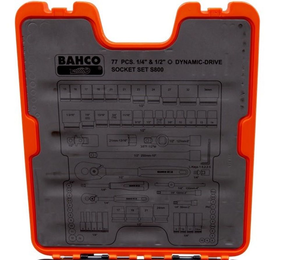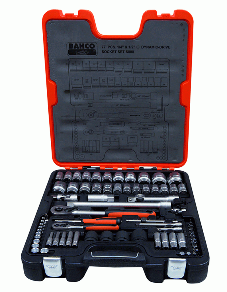 Bahcos Hylsnyckelsats S800 är en hylssats som innehåller både 1/4" & 1/2" hylsor. S800 består av en mix av totalt 77-delar.