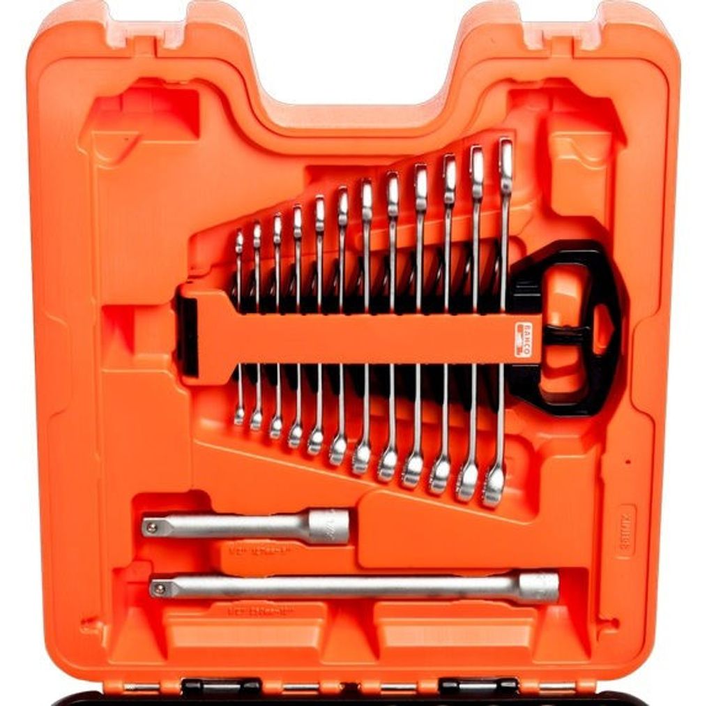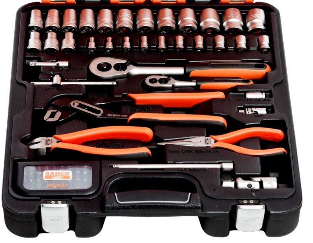 Bahco S81MIX är en komplett hylsnyckelsats med 1/4" och 1/2" fyrkantsfäste och sexkantsprofil. Satsen innehåller också U-ringnycklar, bitssats och olika tänger. Tillverkad i högkvalitativ stållegering med en matt yta, levereras alla verktyg i en robust HDPE-plastväska. Uppfyller ISO 1174 och DIN 3120 standarder.