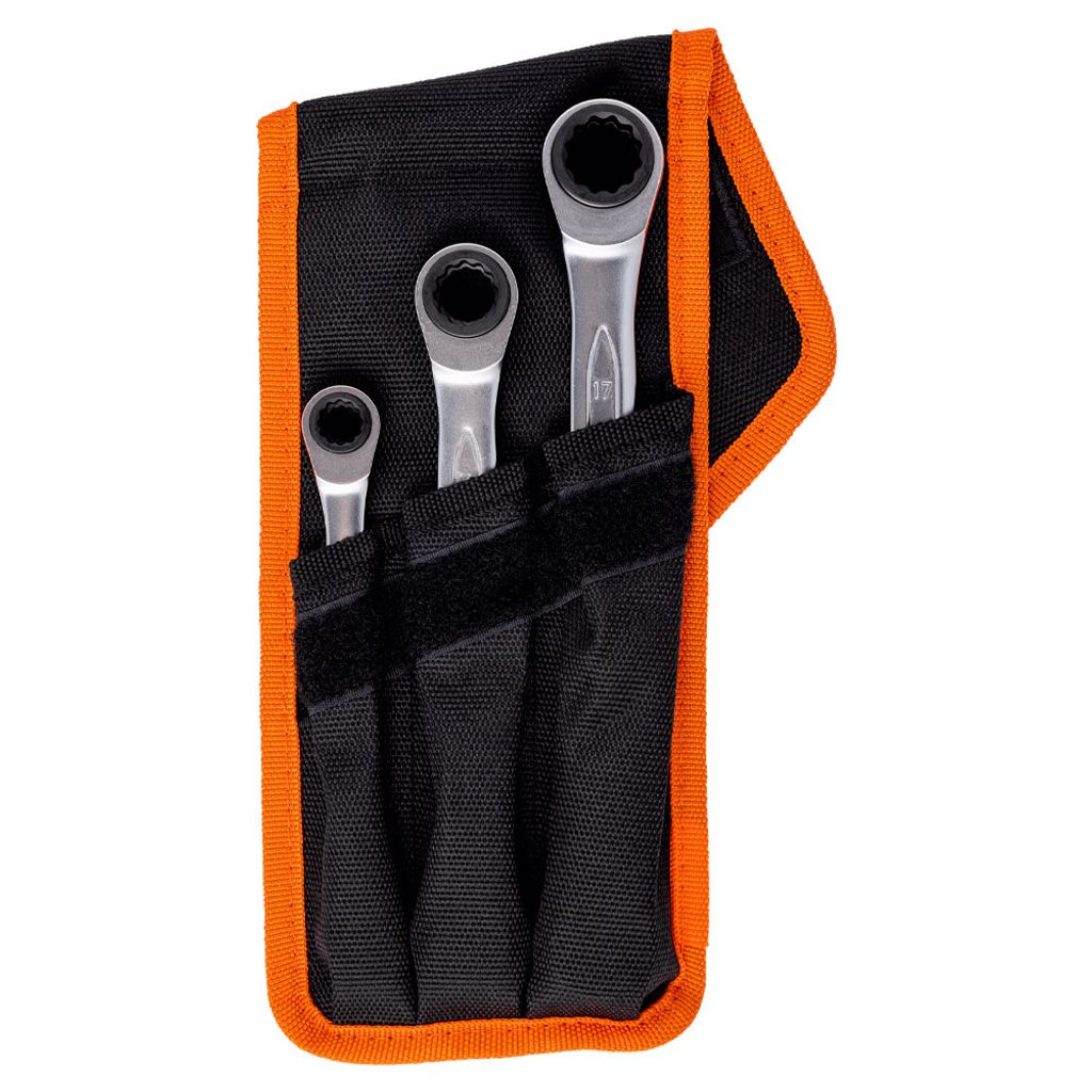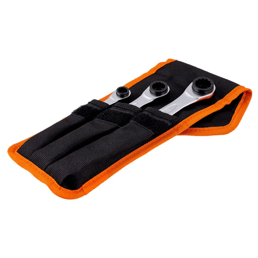 Bahco S4RM/3T är en praktisk spärringnyckelsats med tre nycklar och totalt fyra storlekar per nyckel. Satsen ger hög flexibilitet, bra åtkomlighet och smidig användning vid många typer av monteringsarbeten. Med 5° vinkel, snabb omställning av dragriktning och slitstark Dynamic Drive™ profil får du ett effektivt verktygsset i högkvalitativt legeringsstål som levereras i förvaringsväska med bälteshållare.