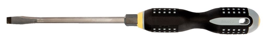 Bahco ERGO spårskruvmejsel med rak spets och gummigrepp är utvecklad med vetenskaplig ERGO process för högsta komfort och minimal ansträngning. Svartoxiderad precisionsspets ger exakt passform i spårskruvar och den förkromade härdade klingan ger starkt korrosionsskydd. Trekomponentshandtag med mjuk räfflad yta ger säkert grepp och hög kraftöverföring samt plan yta och upphängningshål.