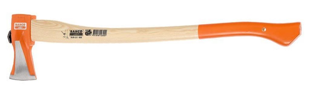 Bahco SUS-2.0-800 är en 800mm lång klyvyxa med ett svängt skaft av askträ. Yxan väger 2,66kg.