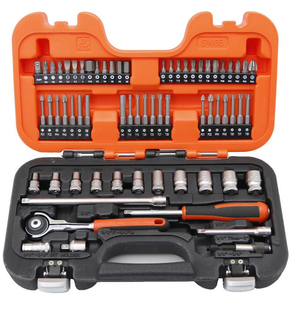 Bahco SW65 är en komplett hylsnyckelsats med olika hyslor, bits, adaptrar, förlängare, vridhantag mm.