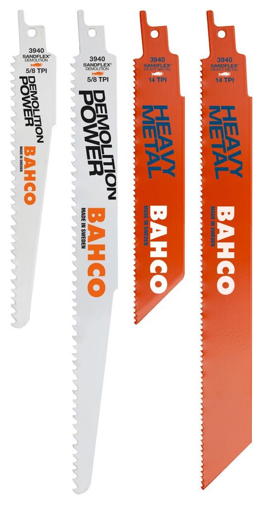 Bahco tigersågbladssats innehåller bladen 3940-150-5/8-DSL, 3940-228-5/8-DSL, 3940-228-10-DSL, 3940-150-14-HST och 3940-228-14-HST. Alla bimetallbladen är extra tjocka och breda för krävande bygg- och rivningsarbeten.