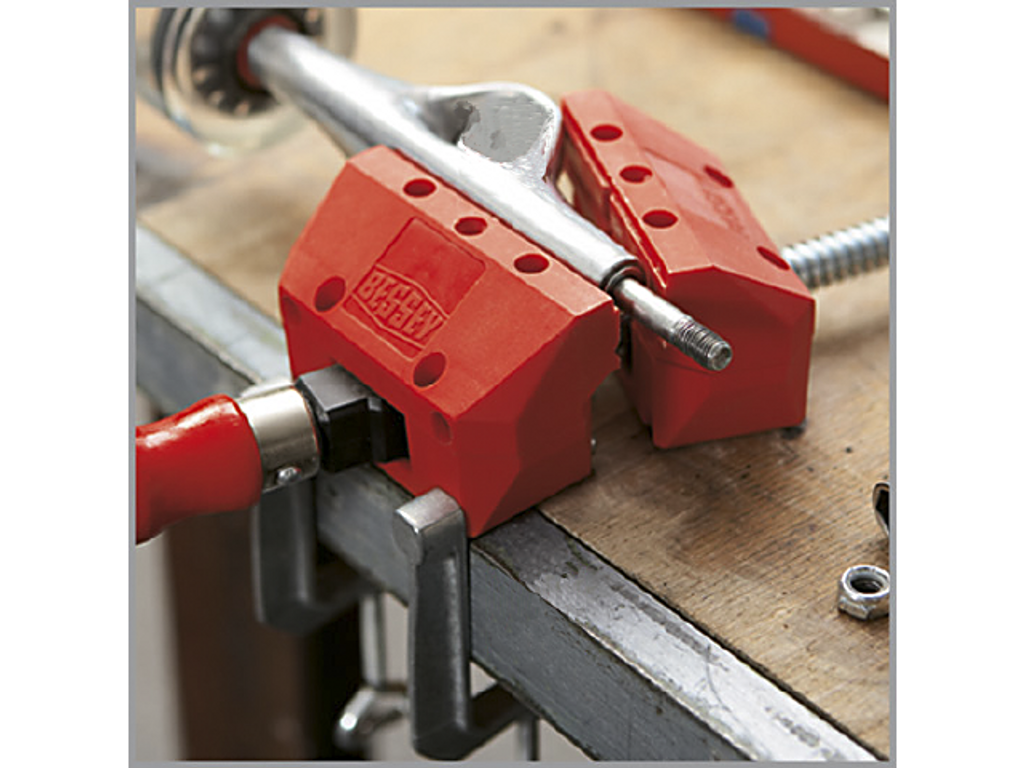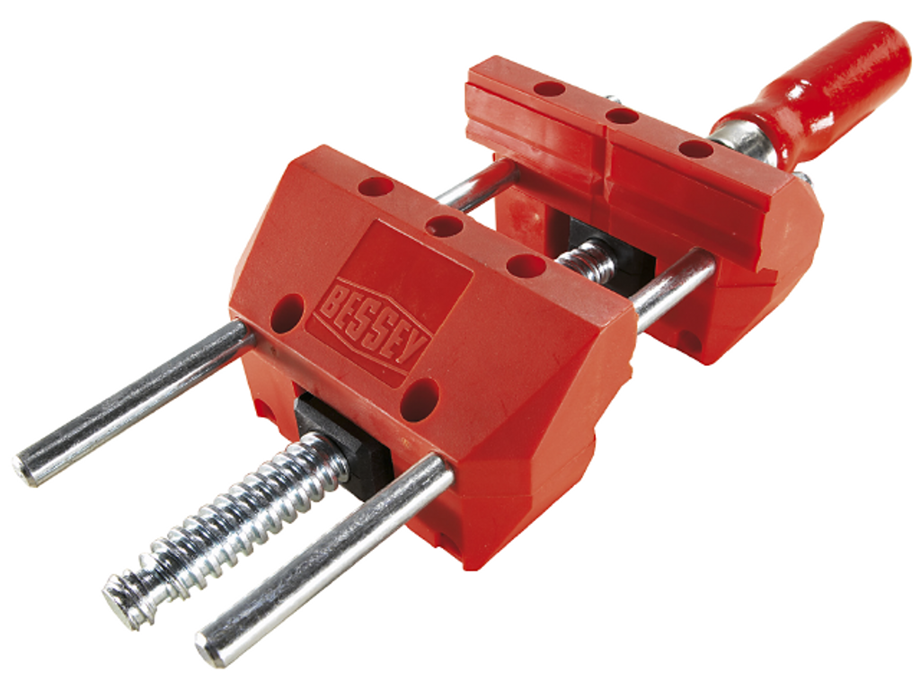 Bessey Skruvtving och skruvstycke i ett verktyg. Med prismatiskt formade backar av glasfiberförstärkt polyamid. Förzinkad spindel med trapetsgänga. Spännhandtag av trä. Om skruvspännarens styrskenor avmonteras kan även icke parallelltjocka föremål fastspännas.