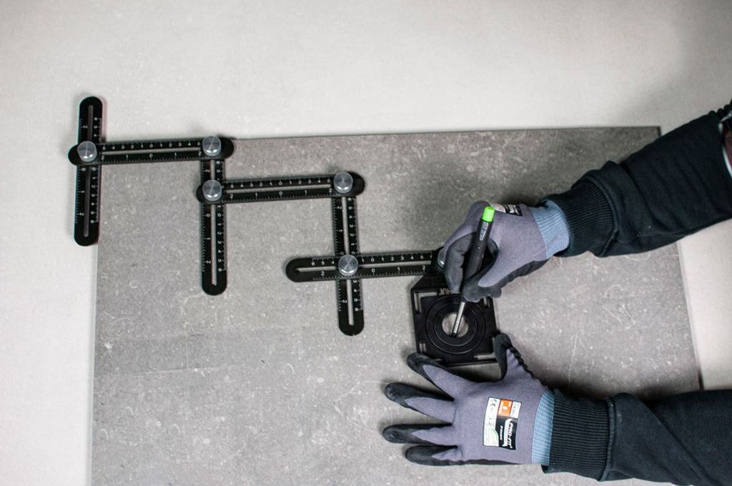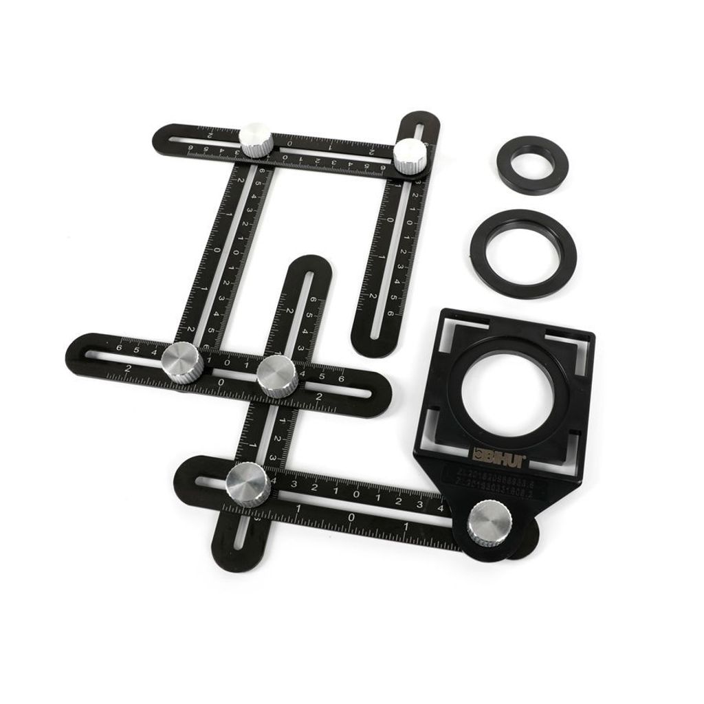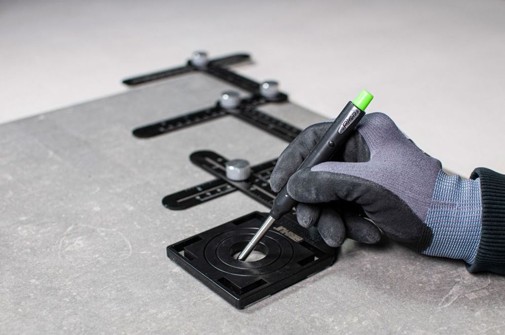 Flexibel och ledbar hålmall. Tillverkad av aluminium. Sex ledbara armar som enkelt justeras och fixeras. För uppmätning och håltagning på kakel, klinker, granitkeramik, glas, marmor etc.