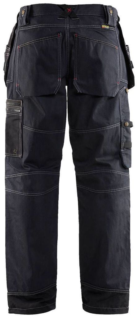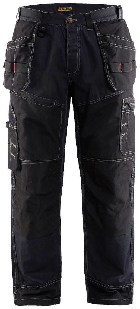 Blåkläder byxa 15001140 med två lösa spikfickor i Cordura med verktygshankar, kan stoppas innanför byxan. Sidfickor. Två bakfickor med bälg. Hammarhank. Gylf med knappar. Ficka på lår. Förstärkt tumstocksficka med pennficka och dubbel knivhållare.