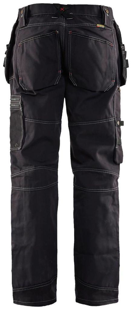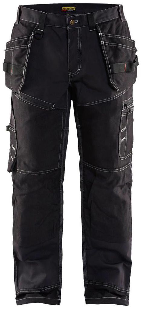 Blåkläder byxa 15001370 med två lösa spikfickor i Cordura med verktygshankar, kan stoppas innanför byxan. Gylf med knappar. Sidfickor. Två bakfickor med bälg. Hammarhank. Ficka på lår. Förstärkt tumstocksficka med pennficka och dubbel knivhållare.