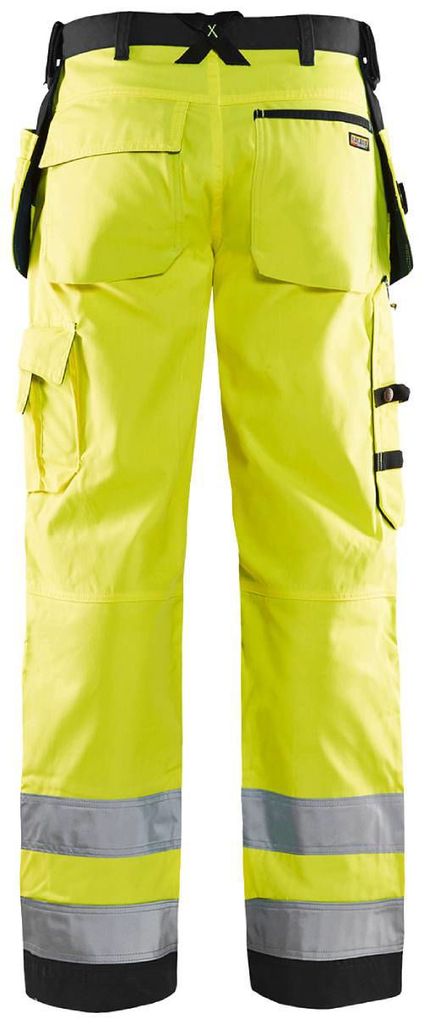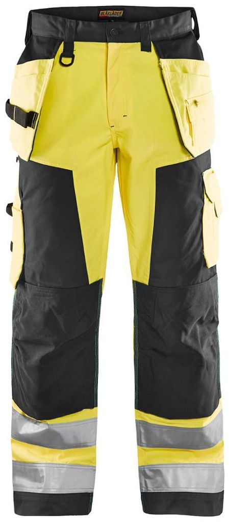 Blåkläder byxa 15681811 med två förstärkta vinklade hängande spikfickor med flera fack och extra bredd. Snedställda fickor under spikfickorna. Två förstärkta bakfickor med bälg, en med lock. Hammarhankar på båda sidor.