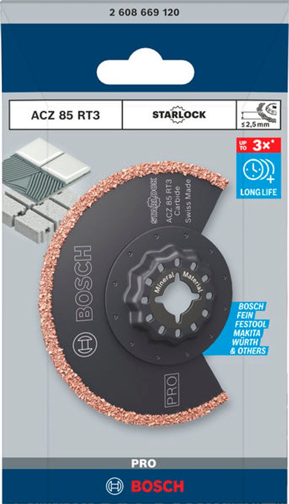 Bosch ACZ 85 RT3 är en högpresterande karbidbelagd segmentsågklinga utvecklad för exakta snitt i hårda material. Med sin 85 mm stora diameter och HM-räfflade konstruktion är denna klinga optimal för urfräsning av fogar i kakel och klinker, samt för att göra små urtag i mjuka kakelplattor utan att skada omgivande material. Klingan lämpar sig även utmärkt för att spårfräsa i lättbetong, vilket gör det enkelt att förbereda för eldragning och rörinstallation under putsade ytor.