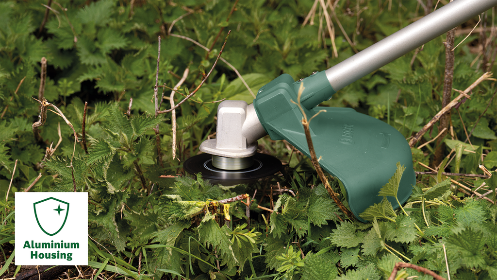 Trimmern erbjuder enkel växling mellan en kraftfull buskröjklinga och en trådspole med extra stark tråd (3 x Ø 3,5 mm). Den generösa klippbredden på 37 cm med tråd och 23 cm med kniv gör att du snabbt får jobbet gjort, även i större eller tätare områden.
