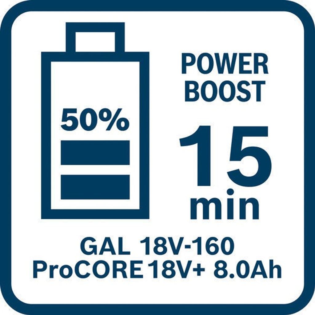 Den medföljande GAL 18V-160 snabbladdaren är en av de snabbaste på marknaden, och kan ladda ett ProCORE18V+ 8.0Ah-batteri till 80 % på bara 44 minuter. Tack vare AMPShare-kompatibilitet fungerar batterierna även med andra verktygsmärken i samma system, vilket gör dem till ett framtidssäkert val. Bosch Professional 18V-systemet säkerställer att batterierna är fullt kompatibla med alla Bosch 18V-verktyg sedan 2008.