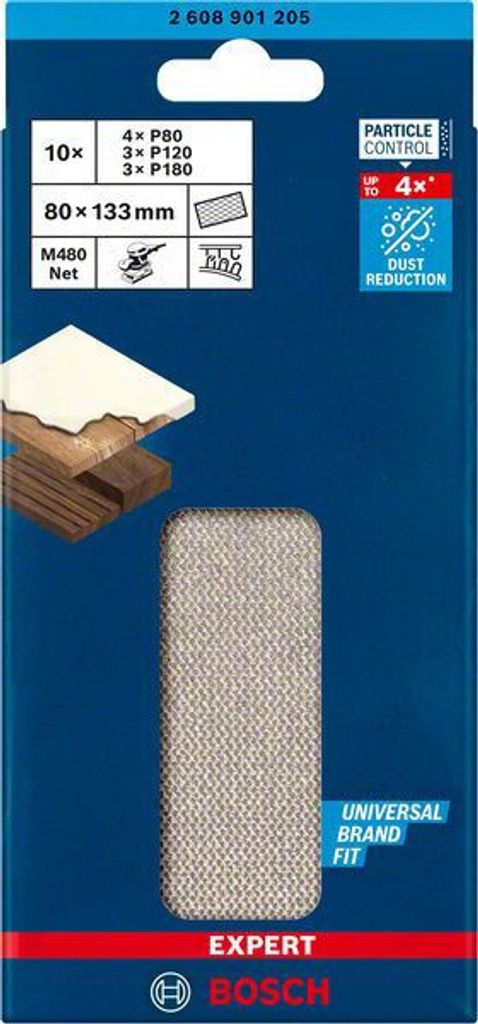 Dammfri slipning av trä, färg och gips - Bosch Particle Control ser till att alla dammpartiklar sugs in i dammsugaren eller filtret. Bosch Expert M480 slipnät återfinns i systemets främsta led: Partiklar går rakt genom det öppna nätet i stället för att täppa igen ytan eller förorena luften. Det gör det också mycket effektivt och extremt hållbart. Sätt bara fast det med kardborre.