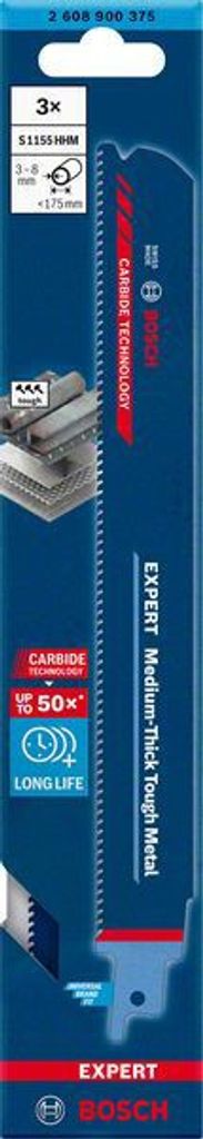 Lång livslängd för sågning i medelgrov, tuff metall - Extrem hållbarhet är inbyggd i bladet med Bosch Carbide Technology. Bosch Expert 'Medium-Thick Tough Metal' tigersågblad är vårt specialiserade blad till medeltjockt stål – hårdmetalltänderna har en finare tanddelning än motsvarigheten för tjock metall. Det innebär att enskilda tänder inte fastnar i tunnare plåtar eller medelgrova rör. Ett specialiserat, avancerat blad som gör det lätt att arbeta med den här sortens metaller. Passar alla tigersågar med S-skaft.