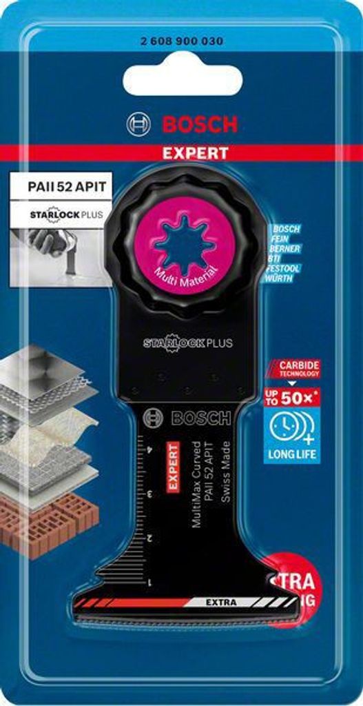 Lång livslängd vid sågning i metallplåt och slipande material - Det här förstklassiga multiverktygsbladet rymmer det allra senaste inom Bosch Carbide Technology: Remsan med ultrahårda tänder är baserad på Boschs unika Curved-Tec-design, så detta är det första bladet som hanterar instickssågning i metallplåt utan skrammel. Dessutom har det senaste nytillskottet i Expert MultiMax-familjen extra beläggning på hårdmetalltänderna för ännu längre livslängd. StarlockPlus-fäste för maximal kraftöverföring och smidiga bladbyten på 3 sekunder.