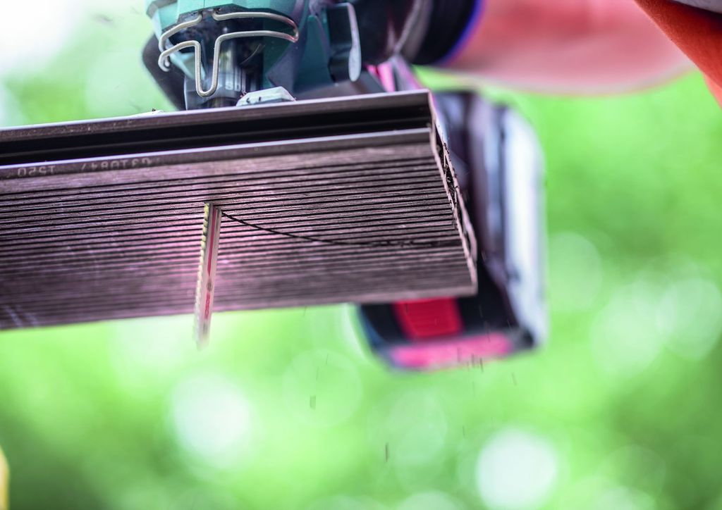 - Perfekt för raka snitt i massiva skivor, krävs för att bygga kök och badrum med massiva skivor, skär raka snitt i trä- och plastkompositplattor (WPC) vid montering av terrasser.