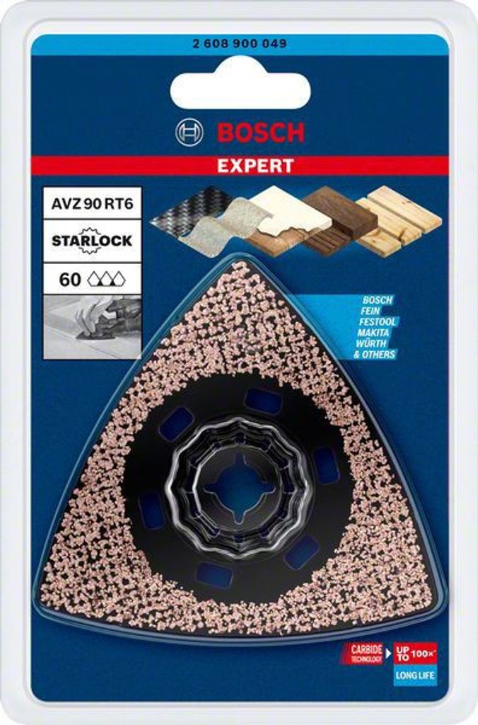 Slipning av olika material med lång livslängd - Med hjälp av Bosch Carbide Technology har hårdmetallkorn hållbart fästs i ytan. De vassa kornen behåller sin effekt under hela den långa livslängden, eftersom du kan rengöra dem med lösningsmedel. Expert Sanding Plate (Expert slipplatta) är utformad för flera material och användare. Starlock-fäste för maximal kraftöverföring och smidiga bladbyten på tre sekunder.