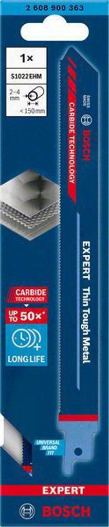 Lång livslängd för sågning av tunn, tuff metall - Expert 'Thin Tough Metal' är ett stort steg framåt i utvecklingen av tigersågblad, där hårdmetallen integreras i en tandutformning som är optimerad för stålplåt och rör. Tänderna är slipade till en fin geometri som gör att även tunna plåtar av rostfritt stål kan skäras smidigt. Passar alla tigersågar med S-skaft.