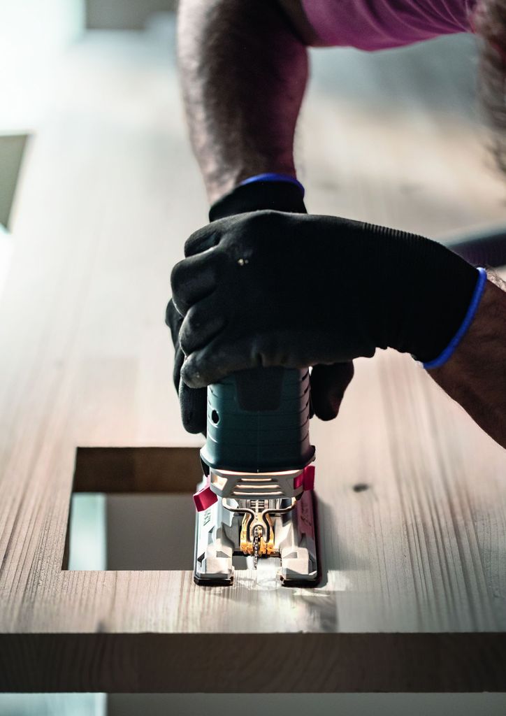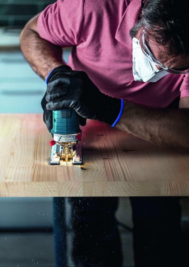 - Perfekt för att göra snitt med exakt vinkel utan avnötning. Sågar i massivt trä med upp till 50 mm tjocklek, till exempel för att bygga möbler utan slipning.