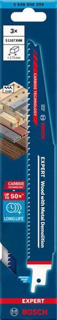 Lång livslängd för sågning i trä med metall - För det tuffaste rivningsarbetet utvecklade Bosch Expert 'Wood with Metal Demolition'. Tack vare den progressiva tanddelningen överraskas bladet inte av förändringar i materialets tjocklek. D individuellt förstärkta tandaxlarna står emot tuffa möten med inkapslat, höghållfast stål i trä. Och alltsammans understöds av hårdmetallens förmåga att skära genom allt som kommer i dess väg. Passar alla tigersågar med S-skaft.
