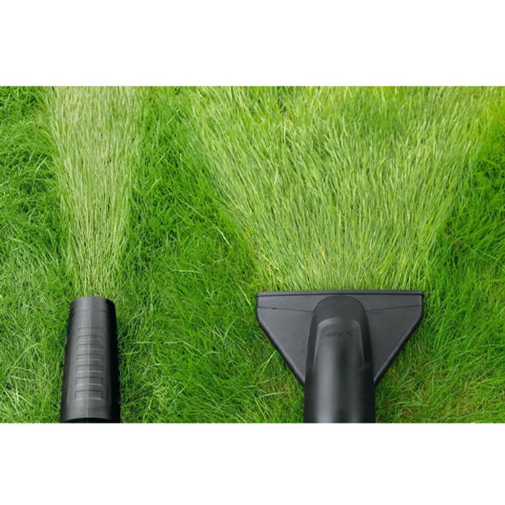 Ergonomin är utvecklad för långa pass. Låsknappen håller avtryckaren aktiverad för mindre belastning i handen och den välbalanserade konstruktionen gör maskinen lätt att styra även på trånga ytor. Munstyckspaketet ökar mångsidigheten ytterligare. Koncentratormunstycket riktar luftstrålen in i hörn och längs kanter medan det platta munstycket breddar luftflödet för att lyfta bråte på större ytor i ett drag.