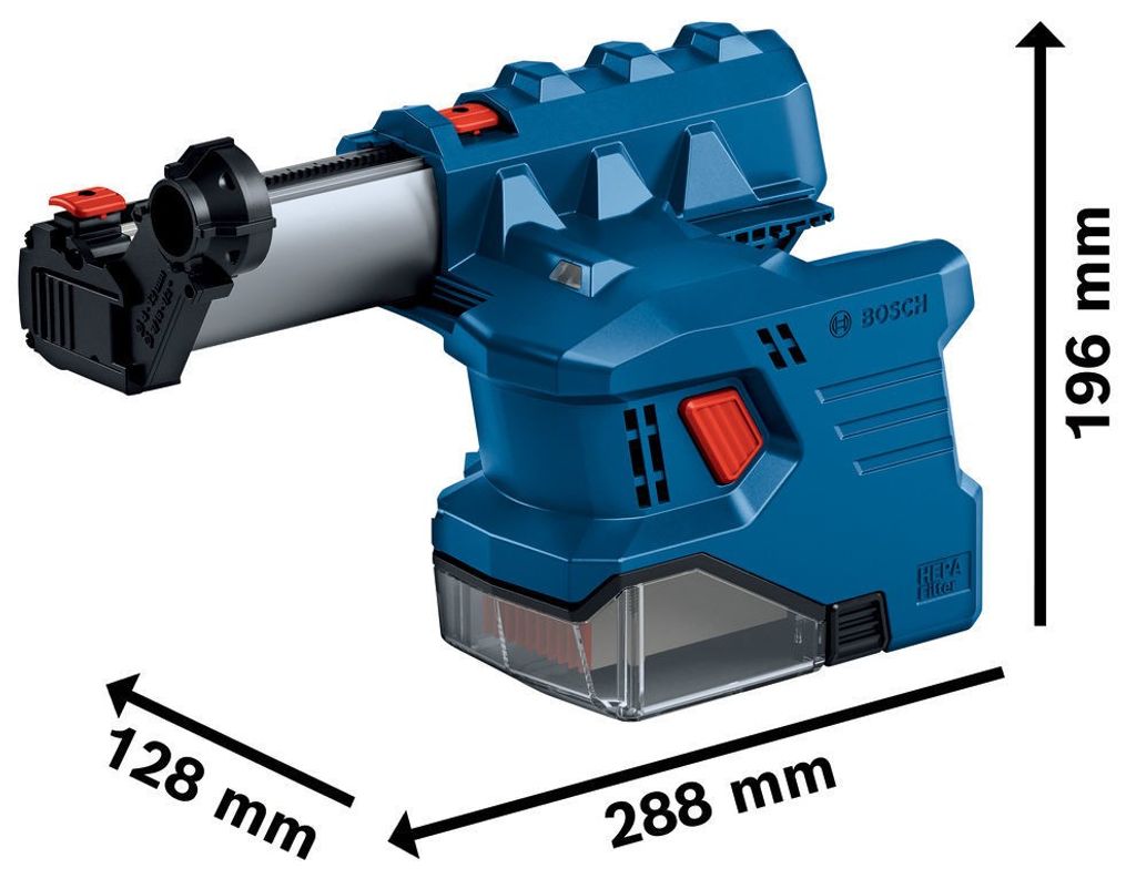 Detta dammutsug är speciellt utvecklat för Bosch GBH 18V-22 Professional borrhammare och är optimerat för hålstorlekar mellan 6 mm och 12 mm. Tack vare sin lätta vikt på endast 1,1 kg och ergonomiska design kan verktyget hanteras med en hand, vilket gör det idealiskt för arbete över huvudhöjd. De stora upplåsningsknapparna gör installation och borttagning smidig, och en centrerad LED-lampa säkerställer perfekt belysning av arbetsytan.